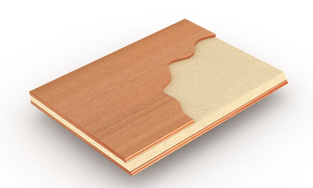 Pannello composito leggero ad elevate prestazioni meccaniche, con facce in Compensato Marino Okoumè e inserto con struttura reticolare a cella piena, costituita da sfogliato di Okoumè e schiuma estrusa di polistirene (STYROFOAM® – DOW CHEMICALS) con densità pari a 33 Kg/m³